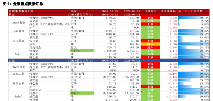 沪金跌 0.20 %,报 1041.50 元/克,沪银跌 1.88 %,报 18966.00 元/千克;COMEX 金跌0.21%,报 4714.10 美元/盎司,COMEX 银涨 0.39 %,报 75.80 美元/盎司;美国10 年期国债收益率报 4.34 %,美元指数报 98.80 ;
